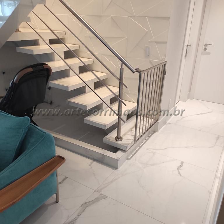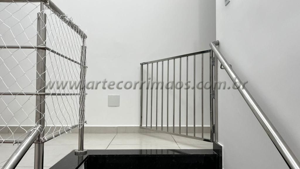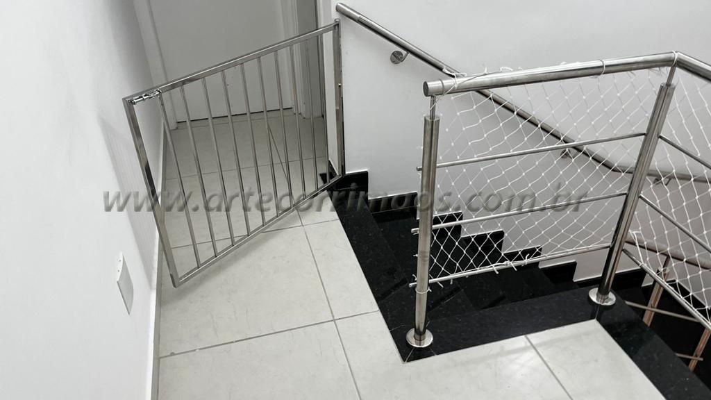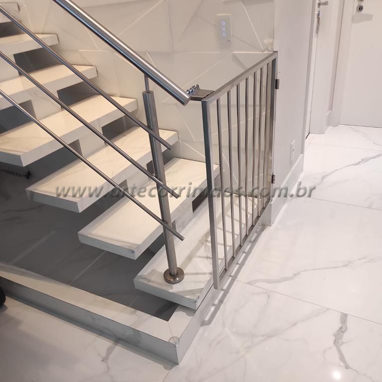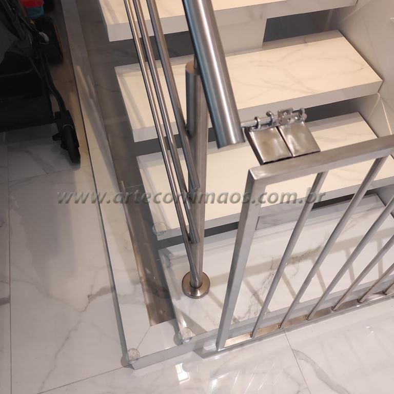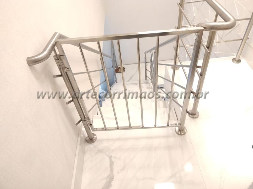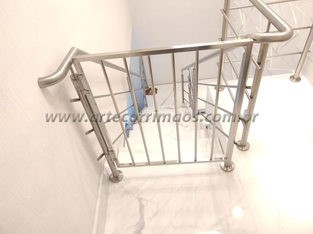 Temos abaixo alguns feito em alumínio com pintura eletrostática, portão em aço inox, em alumínio branco, portãozinho de ferro, de madeira, alguns modelos removíveis, portãozinho em vidro, ultimamente é muito usado esses portãozinho para bebe ou animais de estimação, segurança para a família evitar acidentes na escada, sempre temos um modelo que adequado para cada tipo de escada, guarda corpo, etc.